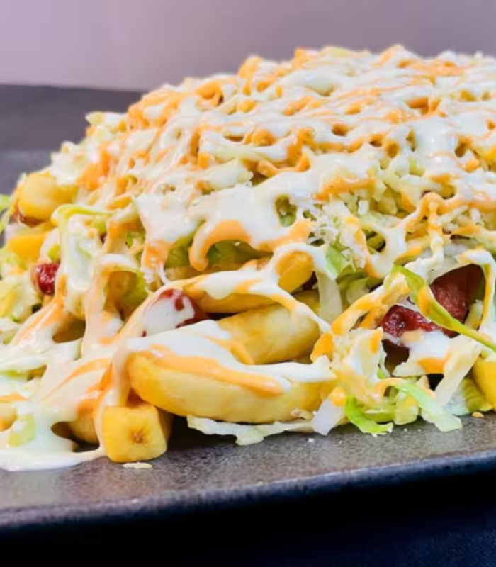 Papas fritas, salchicha, tocineta, queso mozzarella, huvos de codorneiz, ensalada de repollo y salsas de la casa.