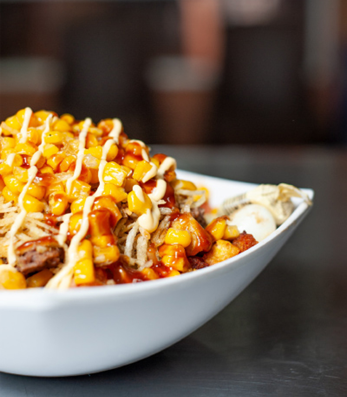 Queso mozzarella, ripio de papas y salsas de la casa.